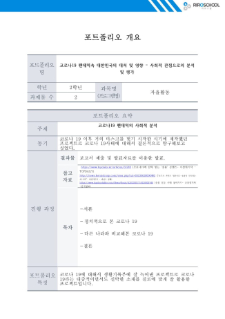 저는 이를 사회계열을 지망하는 문과 학생의 입장에서 정치/경제/행정/국제학적인 측면에서 분석하고 평가해보았으며 해당 내용을 토대로 발표까지 진행하였습니다. 이 포트폴리오는 그 보고서의 내용과 발표자료를 담고 있는 자료입니다. 모두 코로나 19에 대해서 한번쯤은 생기부에 잘 녹여내서 트렌디하면서도 신선한 생기부를 만들어나가시면 좋을 것 같습니다. :)