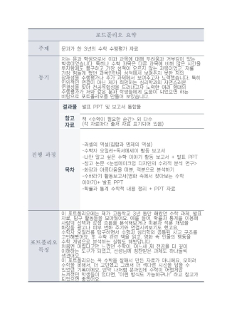 이 포트폴리오는 수학을 잘하지 못했고, 사실 좋아하지도 않았던 문과 학생인 제가 3년 동안 만들어 온 수학 과제와 발표 자료를 묶은 결과물입니다. 처음엔 단순히 ‘해야 하니까’ 했던 수학 과제가, 어느 순간부터는 제가 희망하는 심리학과 뿐만 아니라 제가 좋아하는 문과 과목과도 연결지을 수 있다는 가능성을 보여주기 시작했습니다.