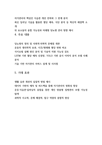 운동과 식습관이라는 전통적 요법에 그치지 않고, LSTM 기반 혈당 예측 모델, YOLO 기반 음식 인식 기술까지 다루며 생활 속 질병관리를 어떻게 기술로 해결할 수 있을지 구체적으로 접근했습니다.