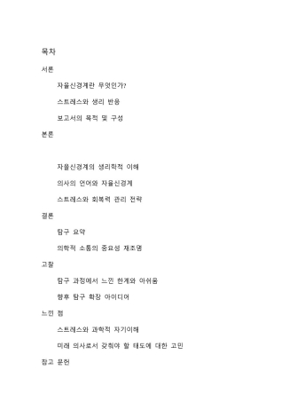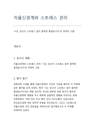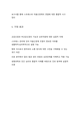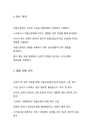 이 보고서는 단순한 독후감이나 요약이 아니라, 생명과학 개념과 의학 지식을 접목한 통합 탐구였습니다. 자율신경계의 구조와 항상성 유지, 만성 스트레스가 인체에 미치는 영향, 그리고 의료현장에서의 소통이 실제 회복력에 어떤 영향을 주는지 과학적으로 고찰하고자 했습니다.