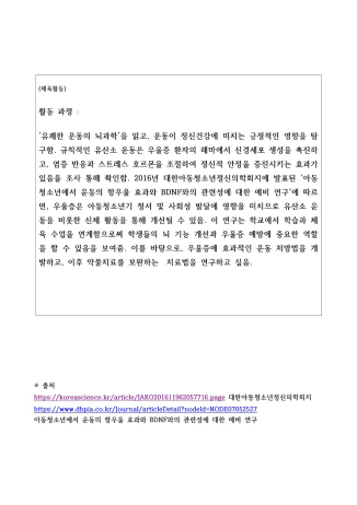 이를 바탕으로 국내외 체육 활성화 사례와 교육적 접근 방안까지 정리하였으며, 향후 약물치료를 보완하는 운동 기반 정신건강 프로그램을 설계하고자 하는 목표를 세우게 되었습니다.