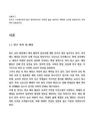 저는 보고서와 독서 활동을 통해 실제 연구 사례를 분석하고, 체육이 신체 건강뿐 아니라 정서적 안정과 사회성, 자기주도성 배양에도 기여한다는 점을 확인했습니다.