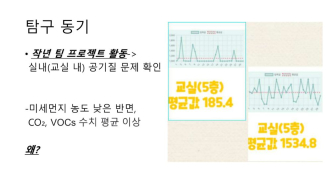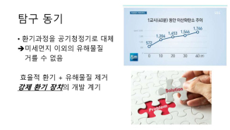 이번 탐구는 교실 내 공기질 개선을 위해 강제환기장치를 직접 설계하고 제작한 사례다. 기존 교실에서는 미세먼지 농도는 낮았지만 이산화탄소와 휘발성유기화합물(VOCs) 수치가 평균 이상으로 나타나, 공기청정기만으로는 모든 유해물질을 해결할 수 없다는 한계를 확인했다. 이에 따라 효율적인 환기와 유해물질 제거를 동시에 실현할 수 있는 강제환기장치 개발이 필요하다는 문제의식에서 출발했다.