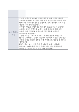 단순히 MBTI 유형별 캐릭터를 넘어, “성격은 자아 인식에 어떤 영향을 줄까?”라는 질문을 던진 이 자료는 심리학적 흥미, 사회적 통찰, 또래 공감을 모두 담은 과제로 심리 분야에 관심있는 학생뿐만 아니라 통계 포스터를 구상하고, 방향을 설정하는데에도 도움이 될 수 있을거라 생각합니다.