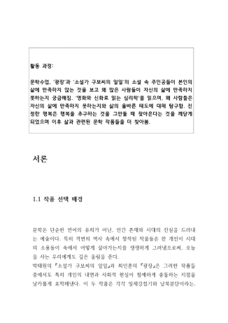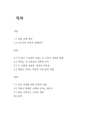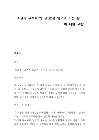 의대 진학을 준비하며 저는 단순한 암기식 공부가 아닌, 깊이 있는 사고와 자기 성찰의 힘이 얼마나 중요한지를 체감했습니다. 특히 ''설가 구보씨의 일일'과 ''광장'을 읽고 작성한 이 보고서는, 문학을 통해 나 자신을 돌아보고, 삶과 인간 존재를 성찰한 결과물입니다.