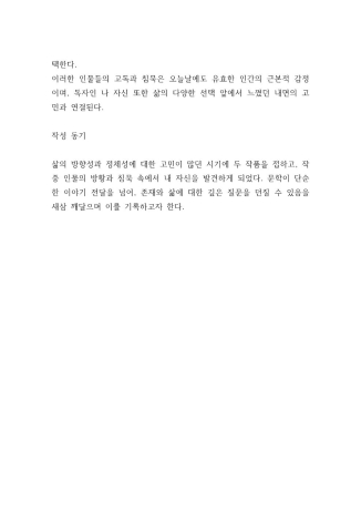 이 글은 단지 과제 수행을 위한 것이 아니라, 고등학교 3년간의 독서와 글쓰기, 질문하고 사유하는 습관의 총합이자, 의대 진학을 준비하며 제가 쌓아온 학습 역량을 보여주는 결정적 포트폴리오입니다. 문학적 해석뿐 아니라, 각 인물과 주제에 대한 심화 분석, 그리고 그것이 나의 삶과 어떻게 연결되는지를 서술하며 자기 중심적 독서력과 표현력을 드러냈습니다.