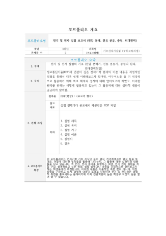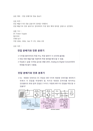 기초적인 전기 및 전자 실험 보고서의 내용이며, 전압 분배기, 전류 분류기, 중첩의 원리, 최대전력전달의 내용을 포함합니다.