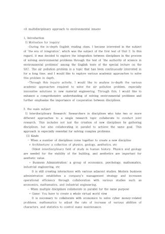 이번 탐구 보고서는 ‘환경 문제에서의 과학의 권위’라는 주제를 중심으로 대기오염 문제를 다양한 학문 분야가 융합적으로 접근하는 방법을 심층 분석한 결과물입니다. 심화영어독해 수업에서 ‘통합의 시대’라는 개념에 관심을 가지고, 수능 특강 영어 지문과 실제 신소재 공학의 혁신적 해결책을 연결하며 환경 문제 해결의 다학제적 중요성을 탐구하였습니다.