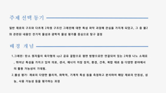 연필심에 쓰이는 흑연에서 시작된 호기심은 아주 얇은 탄소 한 층, 그래핀이라는 물질로 이어졌습니다. 단 한 겹의 탄소 원자로 이루어진 이 물질이 강철보다 강하고, 구리보다 전기가 더 잘 통하며, 빛도 잘 흡수한다는 사실은 처음 들었을 때 믿기지 않을 정도로 신기했습니다. 저는 '왜 그래핀이 이런 특이한 성질을 가질까?', '이런 물질은 실제로 어디에 쓰일 수 있을까?'라는 질문을 품게 되었고, 그 궁금증을 직접 탐구해 보고 싶어 이 주제를 선정하게 되었습니다. 이 보고서에서는 먼저 그래핀의 전기적 물성과 광학적 물성을 중심으로 어떤 실험이나 평가가 이뤄지고 있는지 알아본 뒤, 그 결과들이 어떤 분야에 활용되고 있는지를 정리했습니다. 그래핀은 단순한 과학 이론을 넘어서 반도체, 디스플레이, 에너지 저장장치 등 실생활과 밀접한 미래 산업에 널리 쓰일 가능성이 높은 물질입니다. 이번 조사를 통해 그래핀이라는 소재가 단순히 ‘신기한 물질’에 그치지 않고, 왜 차세대 기술의 핵심으로 주목받는지를 조금 더 깊이 이해할 수 있었습니다.