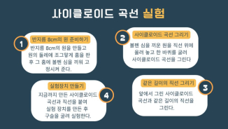친구들과 함께 사이클로이드 곡선 실험을 진행했던 것을 ppt로 만들어서 수학(수2)에서 발표했던 내용이에요.