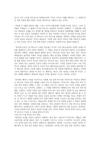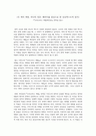 이 보고서에서는 최인훈의 '크리스마스 캐럴'이 가지는 메시지를 디킨스의 '크리스마스 캐럴'과의 비교를 통해 분석합니다. 최인훈의 작품세계를 바탕으로 한 배경 위에 두 작품간의 비교 내용을 통해 상호텍스트성이 최인훈 작품의 해석을 더 심화시킨다는 것을 발견했다는 것으로 결론을 도출했습니다.