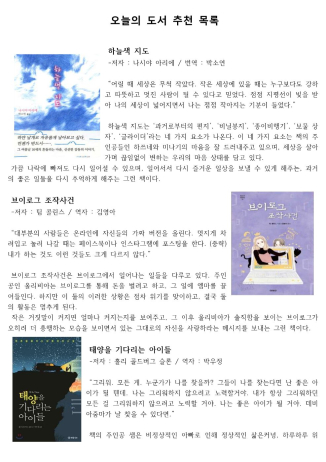 사서 체험단 활동을 하던 중, 읽었던 책들 중 기억에 남는 책들을 소개하는, 추천하는 그런 시간을 가지게 되었습니다. 이 보고서는 그 시간 속에서 진행한 보고서입니다. 오로지 3권만 가능했으며, 추천 자료였기에 간단하게 표지와 글로만 작성한 것이 가장 큰 특징이며, 책을 소개하며, 줄거리와 책이 담고 있는 메시지(제가 느낀 느낀 점) 등을 고려해서 작성했습니다. 만일 진로에서 진로 관련 보고서를 작성하게 될 때, 사서를 꿈꾸는 학생들이라면 이러한 보고서도 좋을 거 같습니다.