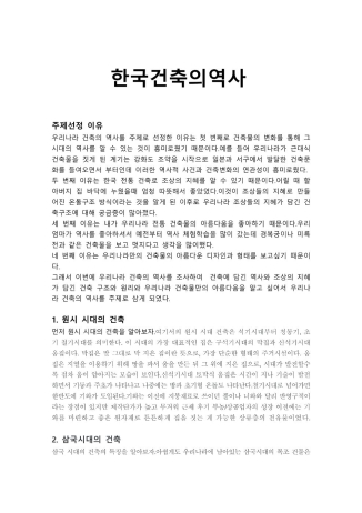 이 포트폴리오는 우리나라 건축의 역사를 주제로, 시대별 건축물의 변화와 그 안에 담긴 조상들의 지혜, 그리고 한국 건축만의 아름다움을 탐구한 결과물입니다. 건축 양식의 변화가 단순히 기술적인 발전만이 아니라, 각 시대의 역사와 문화, 그리고 사람들의 삶과 밀접하게 연결되어 있다는 점에 주목했습니다.