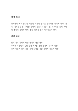 특히 스넬의 법칙 보고서는 과학탐구 주제 선정부터 실험 설계, 분석, 발표까지 전 과정을 스스로 구성하며 얻은 성취이자, 자기주도성과 논리력을 인정받은 사례입니다.