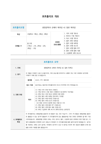 이 포트폴리오는 생명공학을 중점으로 한 활동이 있는 것은 아닙니다. 그러나 제 경험상 생명공학을 중점으로 활동할 수 있는 생기부 활동보다 이 포트폴리오에 있는 활동들처럼 다른 과목과 연계해야 할 때가 가장 고민되었습니다. 생명공학을 진학한 선배는 국어, 한국사, 물리, 고급화학 등의 과목에서 어떤 책을 읽고, 어떻게 생명공학과 연계하여 녹여 내었는지 여러분이 이 포트폴리오를 통해 알아가셨으면 좋겠습니다.