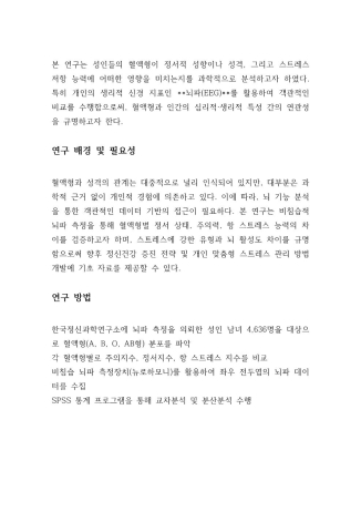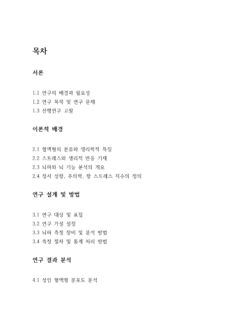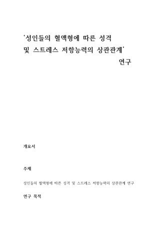 이 포트폴리오는 제가 직접 기획하고 작성한 과학탐구 보고서로, ‘혈액형과 성격 및 스트레스 지수 간의 관계’를 이론적으로 분석한 결과물입니다. 실제 실험 장비가 아닌 문헌 연구와 성격심리학, 인지심리학 이론 분석을 통해 고등학생도 충분히 수행 가능한 수준에서 주제에 접근했습니다.