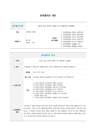교외 봉사가 대입에 반영되지 않게 되면서 봉사로 인성을 보여주면서도 진로와 연관된 활동을 하기가 어려워 졌습니다. 이에 저는 학교 홈페이지를 열심히 찾아본 결과 학생주도 프로젝트 봉사라는 것을 알게 되었습니다. 이 학생주도 프로젝트 봉사는 원하는 봉사를 하고 싶은 학생들끼리 모여 한 학기 동안 수행할 봉사를 기획하고 실천하여 봉사를 인정 받는 것입니다. 만일 여러분의 학교에도 학생주도 프로젝트 봉사가 있다면 꼭 친구들과 함께 기획하여 참여해 보시길 바랍니다.