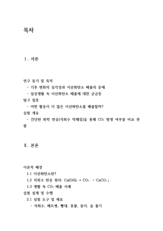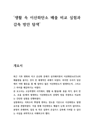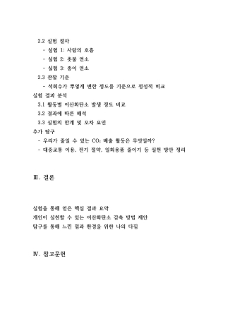 이번 포트폴리오는 석회수를 이용한 간단한 실험을 통해 이산화탄소 배출 유무를 확인하고, 사람의 호흡, 양초 연소, 종이 연소 활동 간의 배출량을 비교한 과정을 담고 있습니다. 실험 결과를 분석한 뒤에는 이를 바탕으로 학생으로서 실천할 수 있는 CO₂ 감축 전략까지 도출해냈습니다.