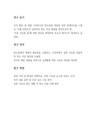 이 보고서는 해당 도서의 핵심 내용을 정리하고, 도서에서 소개된 탄소중립 기술(수소에너지, 태양광, CCS 등)의 과학 원리, 사회적 파급력, 나의 실천방안까지 폭넓게 정리한 결과물입니다. 과학을 바탕으로 환경문제를 탐구하고 이를 학교생활기록부에도 연계해 기록할 수 있는 방식으로 작성하였으며, 고등학생의 수준에서 실현 가능한 실천과 교육적 의미까지 담았습니다.