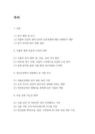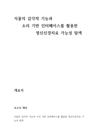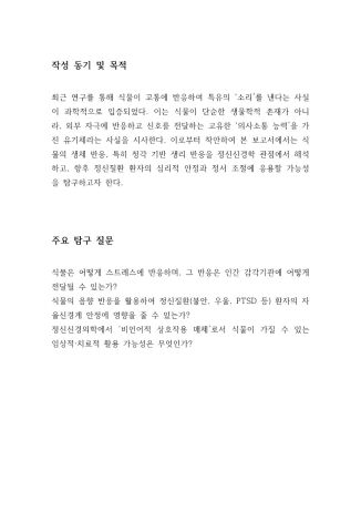 이 보고서는 식물의 소리, 전기신호, 생체 반응을 기반으로 인간의 정서와 뇌신경 활동을 조율하는 새로운 형태의 정신과 치료 가능성을 탐구한 융합형 과제입니다. 감각신경학, 생물물리학, 환경심리학 등 다양한 분야를 넘나들며 신경과학과 자연치유 사이의 연결고리를 찾아갔습니다.