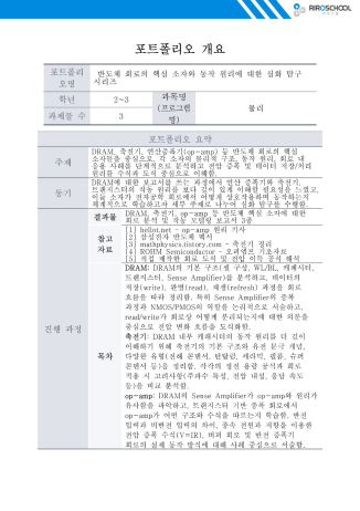 이번 포트폴리오는 반도체를 배울때 가장 많이 배우는 소자인 트랜지스터 다이오드 등을 건너뛰고(!) DRAM, OP-amp, 축전기 요 3가지에 대한 보고서를 묶은 포트폴리오입니다. 본인이 반도체에 대해 조금 안다 하시는 분들이 읽으시면 관련 보고서를 작성하실때 도움이 될 것으로 생각됩니다.
