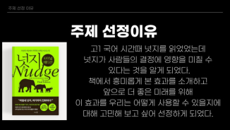 행동경제학의 핵심 개념 중 하나인 ‘넛지(Nudge)’에 대해 탐구한 내용입니다. 넛지는 사람의 선택에 직접적인 강요 없이 자연스럽게 바람직한 방향으로 행동을 유도하는 부드러운 개입 방식을 의미합니다. 본 포트폴리오에서는 넛지의 정의와 원리를 시작으로 다양한 실생활 사례를 통해 넛지가 사람들의 선택에 어떻게 영향을 주는지 살펴보았습니다.