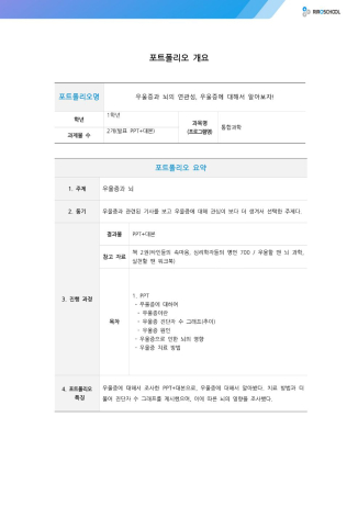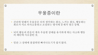 1학년 통합과학을 수강하던 중, 우울증과 뇌의 연관성에 대해서 궁금해져서 조사하게 된 PPT+대본입니다. 보다 자세한 동기는 포트폴리오 내부에 있으며, 사실 지금 와서 보면 우울증과 뇌의 연관성보다는 우울증에 더 치중하지 않았나, 라는 생각이 드는 발표 자료입니다.