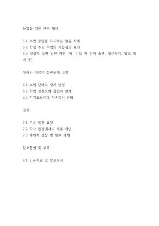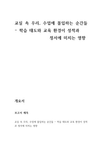 보고서 작성 과정은 단순한 과제가 아닌, 저 자신과 학교생활을 객관적으로 돌아보는 기회였습니다. 교사의 수업 방식, 또래 분위기, 나 자신의 정서 상태가 수업 참여에 얼마나 큰 영향을 미치는지를 체감했고, 그 안에서 몰입이 성적뿐만 아니라 정서 안정, 자존감, 자기 효능감과도 깊이 연결된다는 사실을 깨달았습니다.