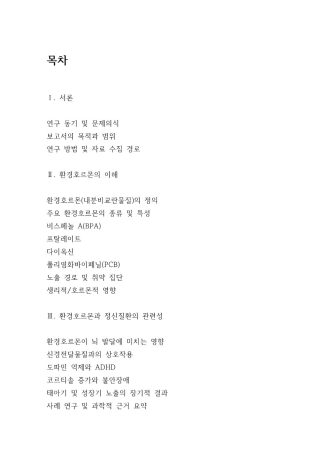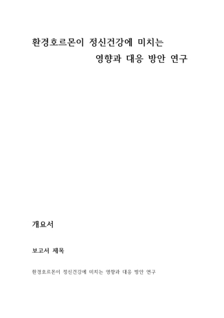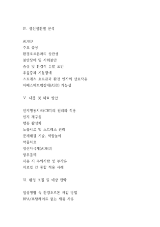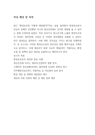이 포트폴리오는 그러한 문제의식을 바탕으로 작성된 15장 이상의 탐구보고서를 중심으로 구성되어 있습니다. 단순한 이론적 정리에 그치지 않고, 환경호르몬이 ADHD, 불안장애, 우울증 등에 미치는 생물학적 작용, 그리고 인지행동치료(CBT), 약물치료, 환경조절 전략까지 통합적으로 제시했습니다.