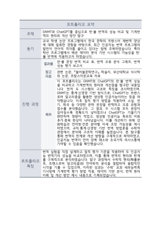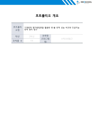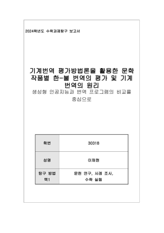 GNMT와 ChatGPT의 한·불 번역 성능을 비교하고 기계번역의 원리와 개선점을 탐구한 내용입니다. 두 시스템의 구조와 특징을 조사한 뒤, 질적 평가 방법을 적용하여 소설, 전기, 희곡 등 다양한 문학 문장을 번역하고 오류 유형과 점수를 분석하였습니다. 분석 결과, 두 시스템 모두 문장이 길어질수록 정확도가 낮아졌으나 ChatGPT는 기울기가 완만하여 영향이 적었고, 생성형 인공지능 특유의 어휘 추가·중복 현상이 나타났습니다. 이를 개선하기 위해 강화학습과 언어쌍·전문 분야별 미세 조정 가능성을 제시하였으며, 규칙·통계·신경망 기반 번역 방법론을 수학적으로 분석하여 구조적 이해를 높였습니다. 이번 탐구를 통해 번역의 한계와 개선 방향을 구체적으로 파악하였고, 인공지능 번역이 언어 장벽 해소와 초국가적 의사소통에 기여할 수 있다는 가능성을 확인하였습니다. 본 탐구 내용은 ‘수학’ 교과 세부능력특기사항에 기계번역 평가 방법 적용, 데이터 기반 분석, 번역 원리 이해 및 개선 방안 제시, 인공지능 기술의 사회적 활용 가능성 탐구로 기록되었습니다.