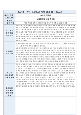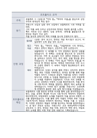 이 포트폴리오는 보들레르의 시 〈상응〉과 , 을 분석하여 프랑스 상징주의와 현대성의 특징을 탐구했습니다. 〈상응〉을 통해 자연과 인간 내면의 상응 관계, 상징적 언어, 운율과 대구 표현의 활용 방식을 분석하였으며, 과 에서는 혁명과 자본주의로 변화한 도시와 군중의 모습을 시 속에서 어떻게 형상화했는지 살펴보았습니다. 또한 ‘예술 작품은 언제나 의미를 가지고 있는가’라는 바칼로레아 논제를 적용하여 보들레르의 시각과 저의 견해를 비교하며, 예술의 의미가 시대성과 본질적 아름다움 속에서 다양한 방식으로 구현될 수 있다는 결론에 도달하였습니다. 탐구 과정에서 작품의 문학적 특징뿐 아니라 사회·역사적 맥락을 결합해 해석하는 역량을 기를 수 있었으며, 이러한 성과는 ‘프랑스어’ 교과 세부능력특기사항에 상징주의 시 분석, 현대성 개념 이해, 문학사적 맥락 분석 및 비평 역량 강화 내용으로 반영되었습니다.