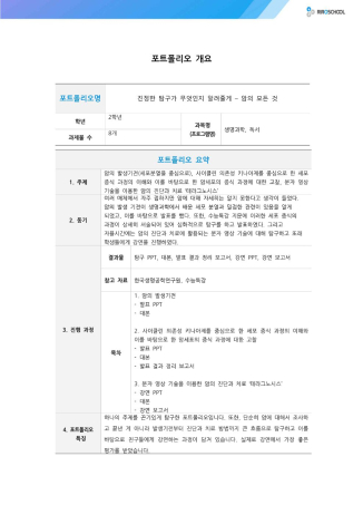 하나의 주제를 끈기있게 탐구한 포트폴리오입니다. 또한, 단순히 암에 대해서 조사하고 끝낸 게 아니라 발생기전부터 진단과 치료 방법까지 큰 흐름으로 탐구하고 이를 바탕으로 친구들에게 강연하는 과정이 담겨 있습니다. 실제로 강연에서 가장 좋은 평가를 받았습니다.