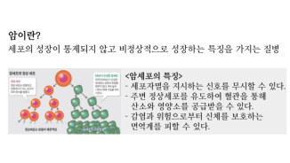 여러 매체에서 자주 접하지만 암에 대해 자세히는 알지 못한다고 생각이 들었습니다. 암의 발생 기전이 생명과학에서 배운 세포 분열과 밀접한 관련이 있음을 알게 되었고, 이를 바탕으로 발표를 했습니다. 또한, 수능특강 지문에 이러한 세포 증식의 과정이 상세히 서술되어 있어 심화적으로 탐구를 하고 발표하였습니다. 그리고 자율시간에는 암의 진단과 치료에 활용되는 분자 영상 기술에 대해 탐구하고 또래 학생들에게 강연을 진행하였습니다.