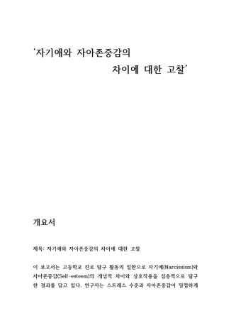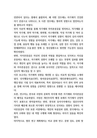보고서를 통해 배운 가장 중요한 교훈은, 과도한 자기애는 불안과 갈등을 낳지만 건강한 자아존중감은 오히려 도전과 성취를 가능하게 한다는 점입니다. 저 역시 학업 과정에서 흔들릴 때마다 자기애적 불안 대신 자아존중감을 키워내려는 노력을 했습니다. 작은 성취를 인정하고, 실패를 성장의 과정으로 받아들이면서 제 학습 태도와 삶의 방향은 크게 달라졌습니다.