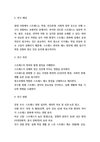 특히 청소년 시기의 스트레스가 학업 효율과 정신 건강에 큰 영향을 준다는 사실을 깨달으며, 자연 환경·사회적 관계·생활 습관·개인 공간이 학생들의 행복과 성취를 좌우한다는 점을 확인했습니다. 이를 바탕으로 저는 생활기록부 탐구 활동, 보고서 작성, 심층 독서 활동 등을 통해 학문적 호기심과 문제 해결 능력을 키워왔습니다.