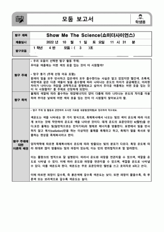 이 보고서는 여름철 어떤 색의 옷을 입는 것이 더 시원할지에 대해, 색종이 밑에 담긴 물의 온도 변화를 측정하는 실험을 통해 과학적으로 탐구한 연구입니다. 흰색은 빛을 대부분 반사하고 검은색은 대부분 흡수한다는 기초 지식을 바탕으로, 빨강, 주황, 노랑, 초록, 파랑, 보라 등 다양한 색깔이 태양 에너지를 흡수하면서 발생하는 온도 차이를 색온도 이론과 연결하여 분석했습니다.