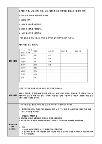 실험은 동일 조건에서 각 색종이 밑에 담긴 물의 온도를 10분, 20분, 30분 간격으로 측정하였으며, 검정색과 보라색 등 어두운 색이 비교적 높은 온도를 보인 반면 흰색은 낮은 온도를 유지함을 확인했습니다. 이를 통해 여름철에는 흰색이나 푸른색 계열의 옷을 입는 것이 상대적으로 더 시원할 것이라는 결론을 도출했습니다.