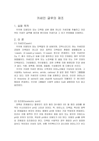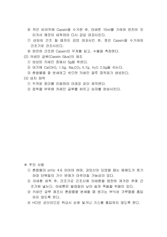 우유에 포함되어 있는 단백질 성분 중에 하나인 카세인을 추출하고 이로부터 카세인 글루를 제조해 봄으로써 카세인과 그 유기 반응들을 이해한다.