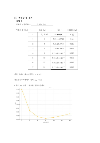 질량, 길이, 최소 진동 주기를 측정 그래프에 따른 주기 길이 그래프를 첨부한다.