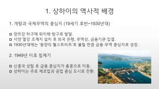 발표의 매력 포인트는 상하이를 단순한 도시가 아닌, 국제 금융과 무역의 전략적 중심지로서 살아 움직이는 사례로 보여주어 실제 경제 흐름과 연결해 이해할 수 있다는 점입니다.