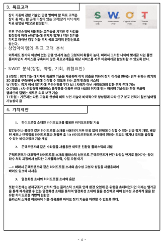해결 방안 : 바이오 장기를 이용한 사업 구축, 3D 프린팅을 통한 하이드로겔 성분의 플라스틱을 재활용한 환경친화적 소재 활용