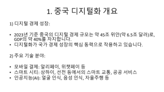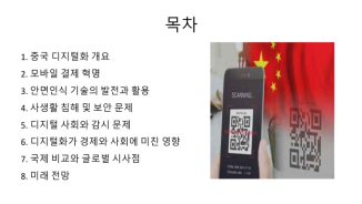 이번 주제를 선정한 이유는, 중국이 세계에서 가장 빠르게 디지털화가 진행되는 국가 중 하나로, 모바일 결제와 안면인식 기술 등 혁신적인 사례를 통해 사회와 경제에 미치는 영향이 크기 때문입니다. 또한, 디지털화 과정에서 발생하는 사생활 침해와 감시 문제 등 윤리적·사회적 논란을 함께 살펴봄으로써, 기술 발전과 사회적 균형에 대해 생각해보고자 했습니다.