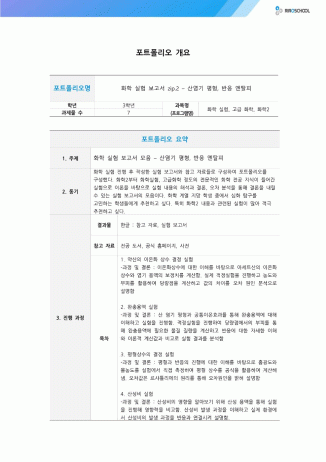 이번 포트폴리오는 화학 실험 진행 후 작성한 실험 보고서와 참고 자료들로 구성하여 포트폴리오를 구성했습니다. 화학2부터 화학실험, 고급화학 정도의 전문적인 화학 전공 지식이 들어간 실험으로 이론을 바탕으로 실험 내용의 해석과 결론, 오차 분석을 통해 결론을 내릴 수 있는 실험 보고서의 모음입니다. 화학 계열 지망 학생 중에서 심화 탐구를 고민하는 학생들에게 추천하고 싶습니다. 특히 다른 실험 보고서들보다도 화학2 내용과 관련된 실험이 많아 적극 추천하고 싶습니다.