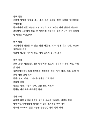 이 포트폴리오는 단순히 학문적 지식을 쌓는 것에서 그치지 않고, 학교·지역사회에서 청소년이 실천할 수 있는 조기개입 모델을 제시했다는 점에서 의미가 있습니다. 멘토로서 저는 이러한 탐구 경험을 바탕으로 후배들에게 연구 방법, 주제 탐색, 글쓰기, 발표 준비까지 체계적인 도움을 줄 수 있습니다.