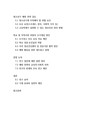 청소년기와 학교 현장에서 실천할 수 있는 예방 전략(수면 관리, 스트레스 조절, 또래 지지, 조기경고 신호 교육)을 구체적으로 제안했습니다.