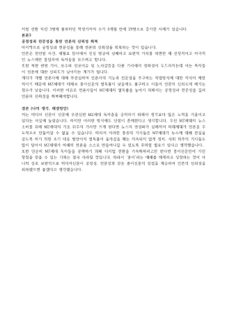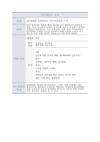 MZ세대를 겨냥한 미디어신문의 노력을 실제 시행하고 있는 웹사이트를 방문하여 느낀점을 바탕으로 작성하여 현실감있다. 또한 시의성이 있으며 동연령대 친구들이 공감할 만한 주제를 다룬 흥미로운 칼럼을 볼 수 있다.