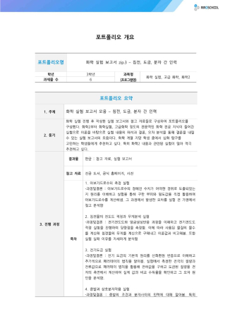이번 포트폴리오는 화학 실험 보고서 zip.3 – 침전, 도금, 분자 간 인력입니다. 화학 실험 진행 후 작성한 실험 보고서와 참고 자료들로 구성하여 포트폴리오를 구성했습니다. 화학2부터 화학실험, 고급화학 정도의 전문적인 화학 전공 지식이 들어간 실험으로 이론을 바탕으로 실험 내용의 해석과 결론, 오차 분석을 통해 결론을 내릴 수 있는 실험 보고서의 모음이다. 화학 계열 지망 학생 중에서 심화 탐구를 고민하는 학생들에게 추천하고 싶습니다. 특히 화학2 내용과 관련된 실험이 많아 적극 추천하고 싶습니다.