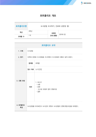 3학년 정치와 법 시간에 진행한 보고서입니다. 도서관법에 대해 조사하고, 그 내용을 분석하고 변화과정, 개정 이유를 찾으면서 직접 작성한 보고서입니다. 정치와 법을 수강한다면, 한 번쯤은 법률을 조사하는 일이 생길텐데, 그럴 때 참고해도 좋을 거 같습니다.