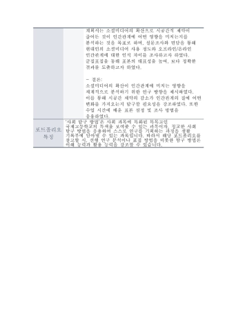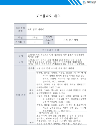 사회과학 계열에 특화된 특목고인 국제고등학교에서 수강한 '사회 탐구 방법'은 논문을 비롯한 선행 연구를 분석하고 논문을 작성하는 방법을 배운 뒤, 이를 활용하여 직접 선행 연구 분석 과정을 거친 뒤 사회 탐구 계획서를 작성하는 과목이었습니다. 소셜 미디어 분야가 진로 관심 분야였기 때문에 대주제를 '소셜 미디어 사용'으로 잡았고, 소셜 미디어와 관련된 논문 3개를 선정하여 주제 및 결론을 정리한 뒤, 평가와 제안을 거쳐 선행 연구 분석을 진행하였습니다. 3개의 선행 연구를 평가하며 느꼈던 기존 연구의 아쉬웠던 점들을 기반으로 새로운 사회 탐구를 제안하는 사회 탐구 계획서를 작성하였습니다. 미디어라는 진로를 희망하면서 고려해야 할 가장 큰 카테고리를 '소통(커뮤니케이션)'이라고 간주하고 있었기 때문에 인간관계라는 키워드를 소셜미디어와 접목하여 주제를 구상하였습니다.