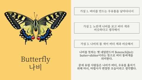 동물 이름의 어원에는 동물의 특징이 담겨 있다는 것을 생각하여 이를 주제로 선정하였고, 우리말과 영어에서의 동물 이름이 차이가 나는 까닭을 관점과 문화차이로 생각하면서 총 20 종류의 동물 어원을 탐구했습니다. 그중 6종류의 동물 이름을 중심으로 발표를 진행했으며 그 동물을 접하게 된 경로와 동물이 갖는 이미지가 이름이 지어지는데 많은 영향을 주었음을 확인할 수 있습니다.